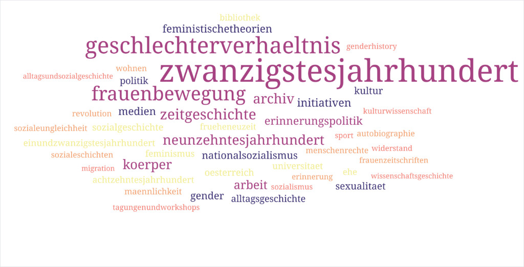 Dieser große Kreis an Schreiber:innen sorgte auch für eine große thematische Vielfalt der Blogposts, wobei sich ein eindeutiger Schwerpunkt in der Zeitgeschichte sowie im 19. Jahrhundert herausgebildet hat. Inhaltlich lassen sich mehrere Cluster erkennen: Körper und Arbeit, Sexualität und Erinnerungspolitik sowie – für einen Blog der Frauen- und Geschlechtergeschichte nicht überraschend – Archive, Feministische Theorie und Gender. Weitere Schwerpunkte bilden sich bei Beiträgen zu Frauenbewegungen, Medien, Nationalsozialismus, Sozial- und Alltagsgeschichte und der Frühen Neuzeit heraus.